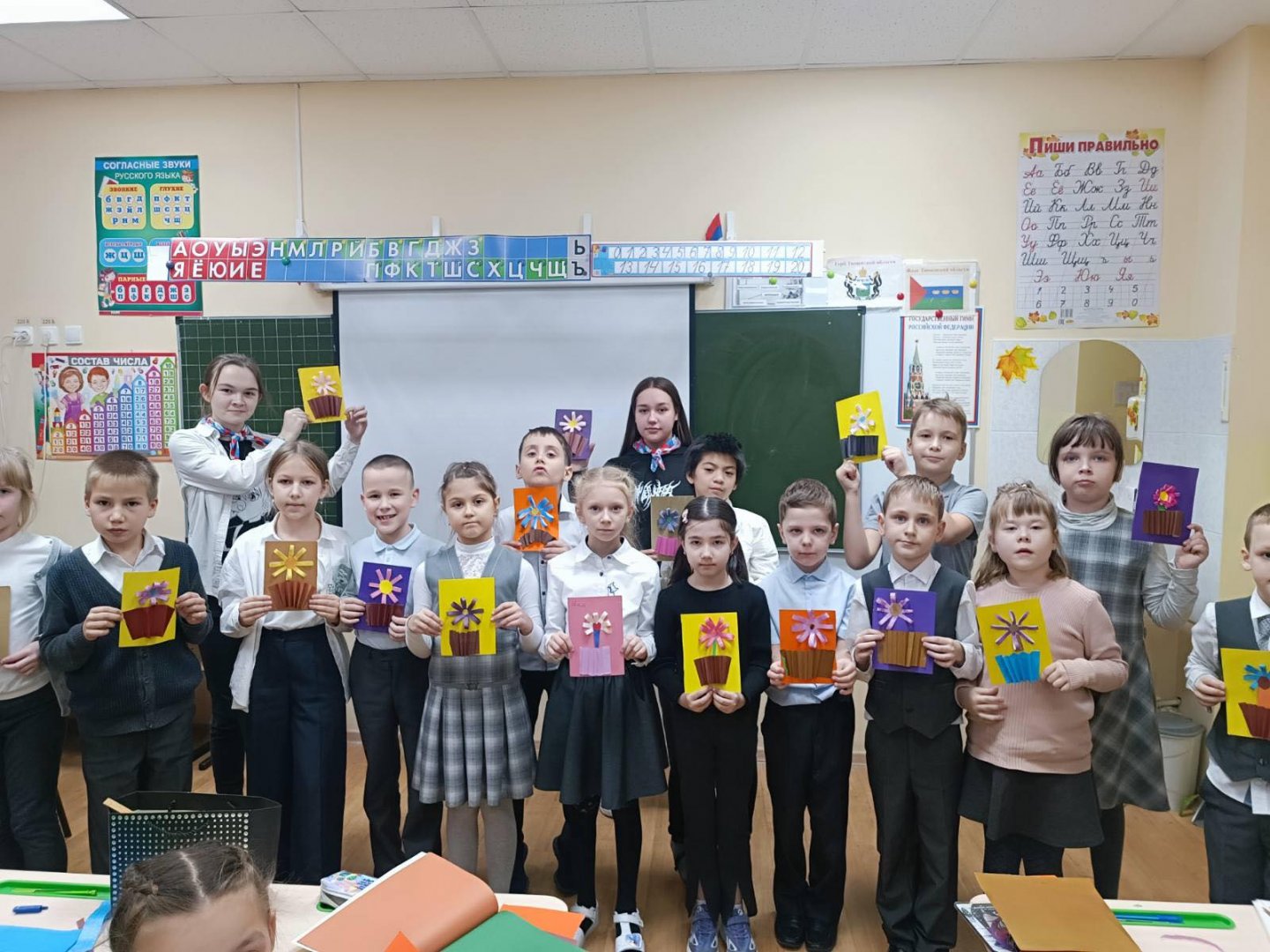 Ученики начальных классов с помощью активистов Российского движния школьников не только вырезали, клеили и подбирали цвета, формы и материалы для работы, но вели беседу о самых дорогих, родных и любимых мамах.