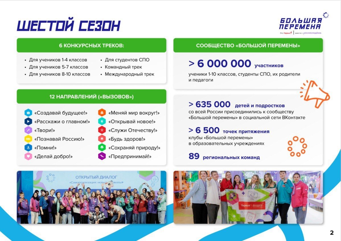 В 2025 году стартовал шестой сезон Всероссийского конкурса «Большая перемена», который теперь официально стал частью Общероссийского движения детей и молодежи «Движение Первых». Это объединение открывает новые возможности для участников, сохраняя при этом дух и ценности проекта .