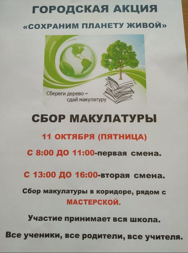 ПРИЁМ МАКУЛАТУРЫ в коридоре рядом с Мастерской, (первый корпус), в фойе на первом этаже ( второй корпус). Акция сплотит всю школу и общими усилиями мы сделаем ОДНО БОЛЬШОЕ ДОБРОЕ ДЕЛО!