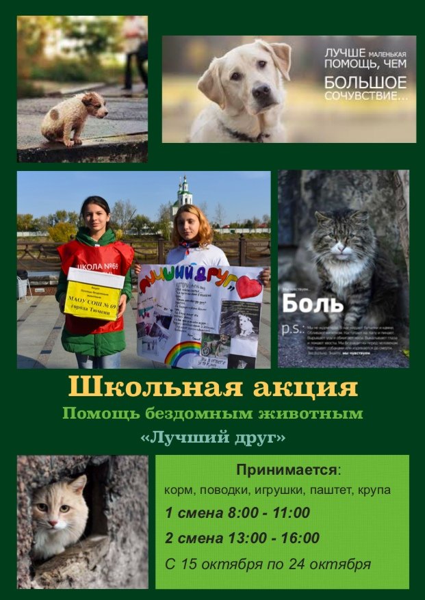 Школьная Благотворительная Акция в помощь бездомным животным "Лучший Друг". Открыт cбор корма для нуждающихся бездомных животных для приюта "Лучший друг". Принимается: корм (мокрый и сухой), поводки, ошейники, пеленки, игрушки, паштет, крупа, и другое. Животные в приюте будут рады любой помощи!