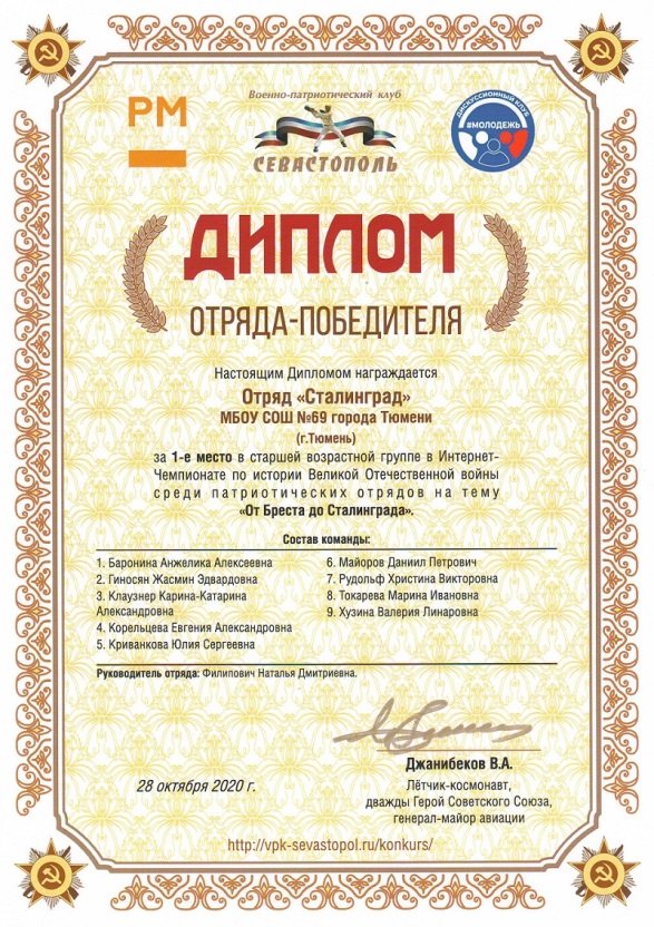 Ваше упорство и воля к победе заслуживают высоких похвал. Благодаря таким юным патриотам и активистам как вы, сохранится для будущего память о народном подвиге. И вы доказали, что готовы принять на себя ответственность перед завтрашним днем, готовы бережно относиться к истории Отечества.