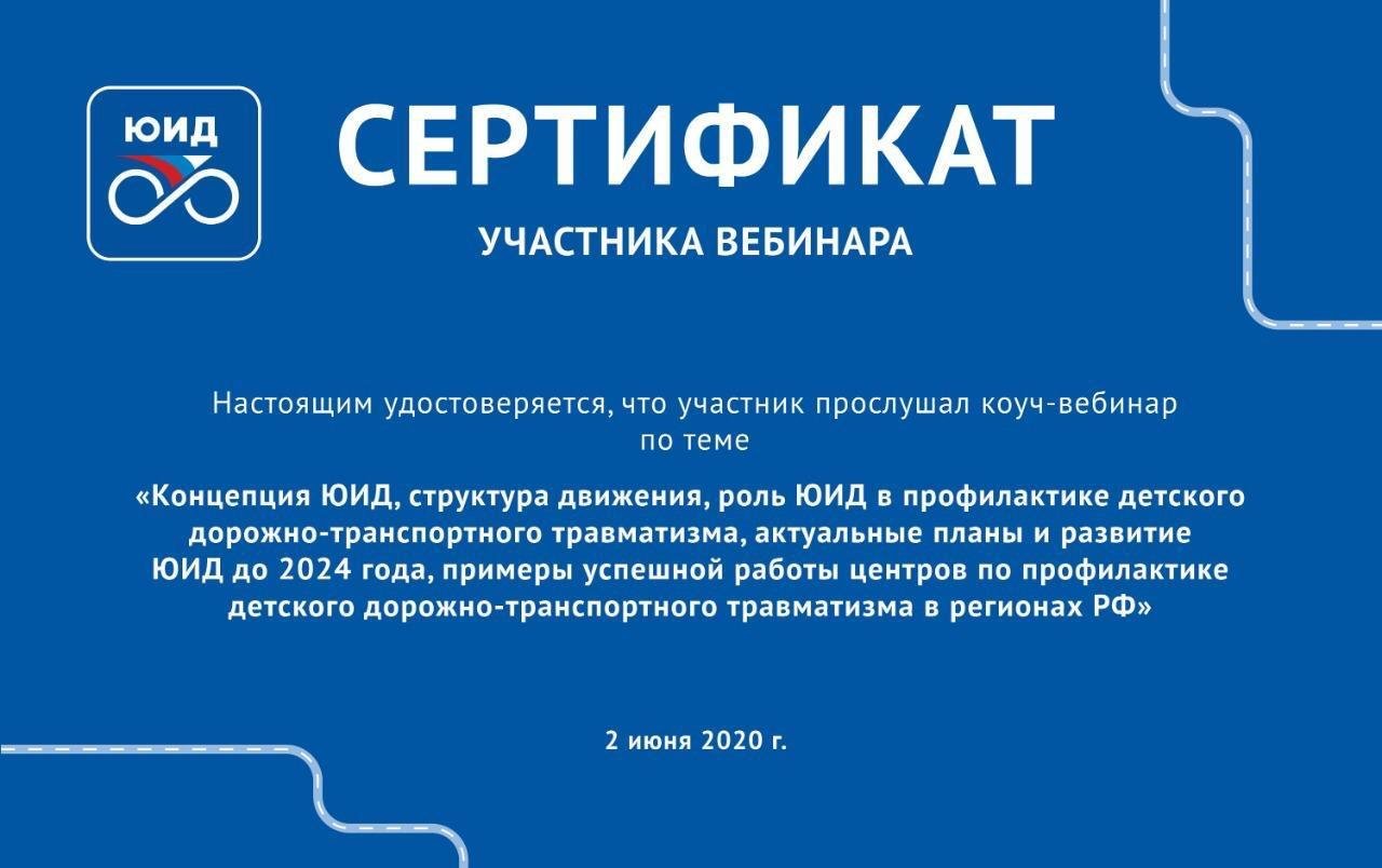 2 июня 2020 года руководитель отряда принял участие в онлайн коуч-мероприятии На первом вебинаре была рассмотрена концепция движения ЮИД, структура и роль ЮИД в профилактике детского дорожно-транспортного травматизма, а также озвучены планы развития движения на текущий год и перспективы на 2024 год.